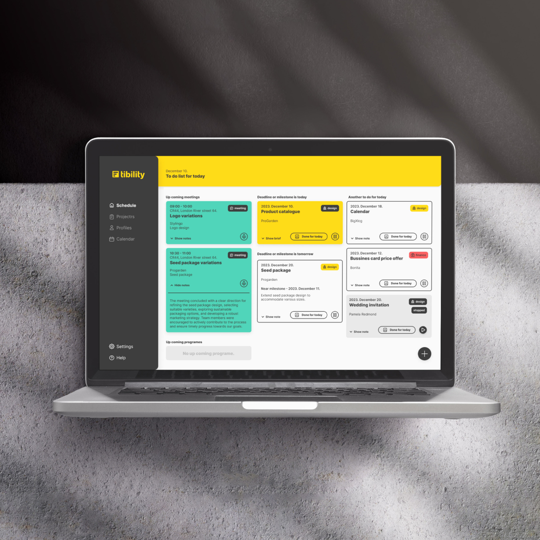 A lehetséges felhasználók minél kevesebb időt szeretnének eltölteni projektmenedzseléssel. A UX kutatás során a megkérdezettek 67%- a naponta kevesebb, mint 15 percet foglalkozik vele. Közel megegyező százalékuk vállalkozásuk indulásakor sticky note-okkal helyettesítette a projektmenedzsment applikációkat. Emellett gyakran tapasztalták, hogy elúsztak a határidőkkel, elfelejtettek információkat és frusztrációt okozott, hogy semmi nem volt egy helyen megtalálható. Az adatok fő következtetése, hogy egy minél könnyebben átlátható, az aznapi teendőkre fókuszáló, de váratlan események bekövetkeztekor minél gyorsabban átrendezhető applikációra van szükségük. Amiben mindezek mellett a hasznos információkat egy helyen tárolhatják, legyen szó projekt brief-ről vagy ügyfél adatokról.
