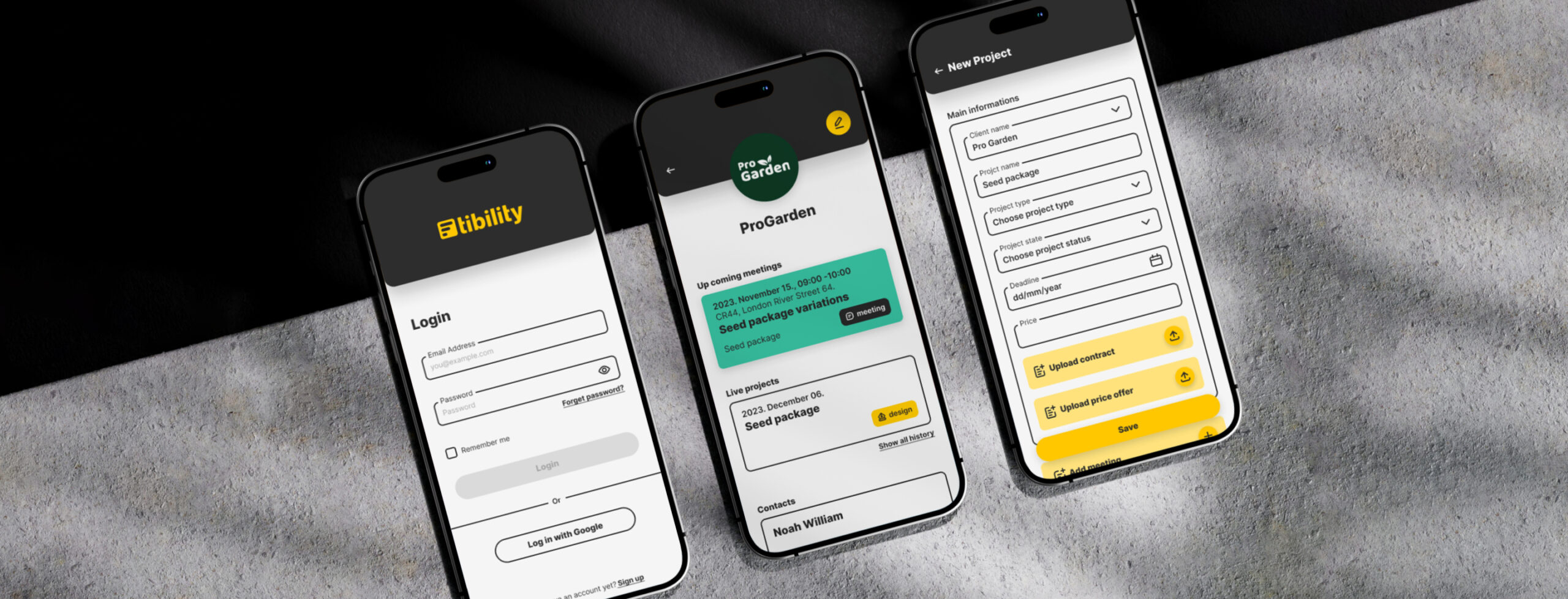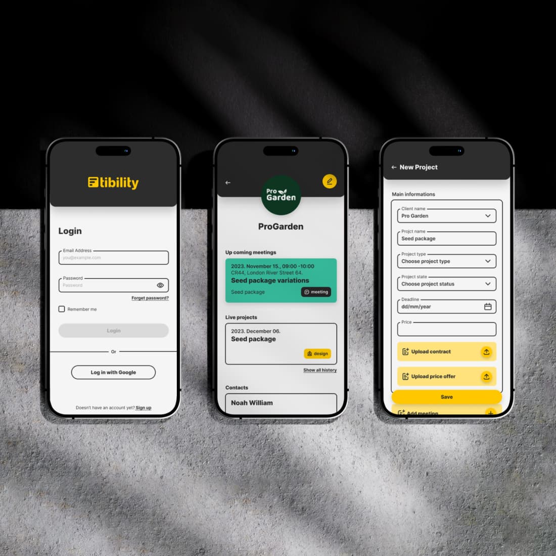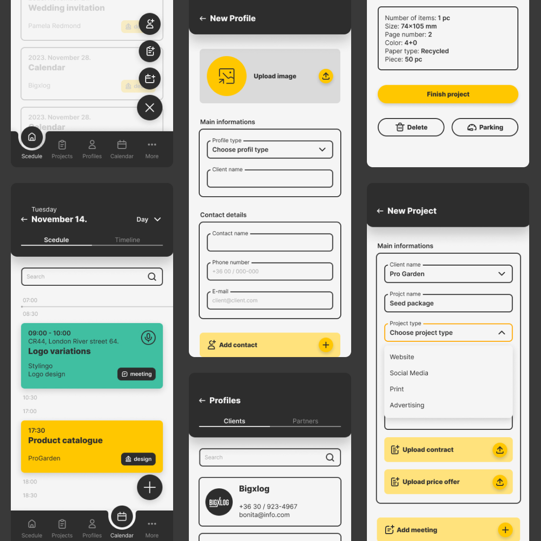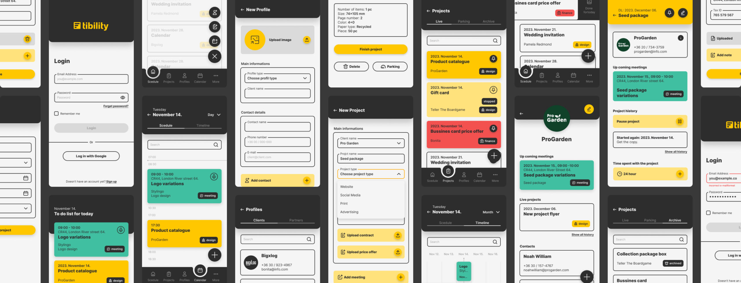 Minden egy helyen: Az applikáción belül hozhatunk létre ügyfél oldalakat és azokhoz kötött projekt oldalakat, melyeken akár szerződéseket is tárolhatunk. Ezek könnyedén átjárhatók. Egy ügyfélprofilt akár a kezdőképernyőre kihelyezett projekt kártyáról is egy kattintással elérhetünk.