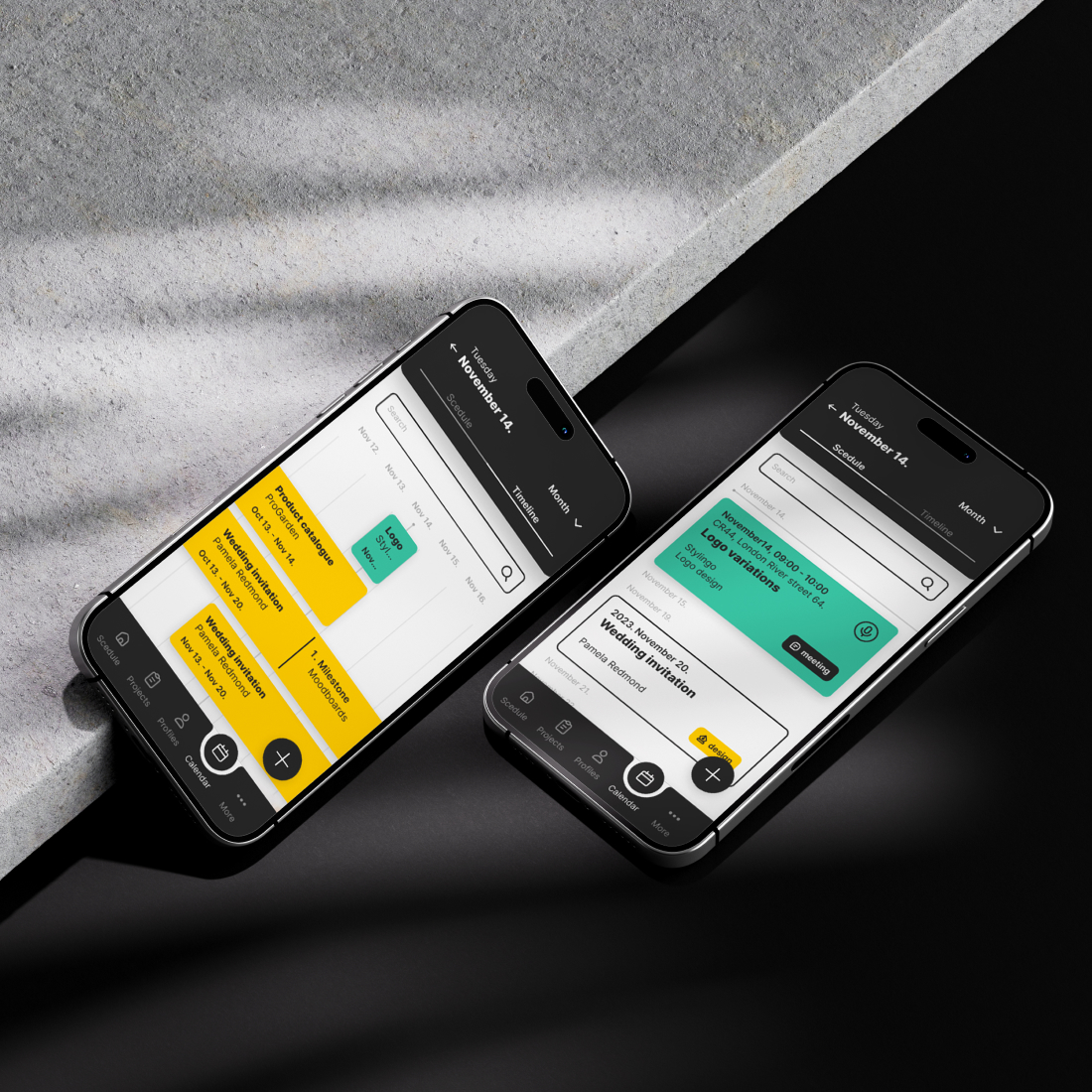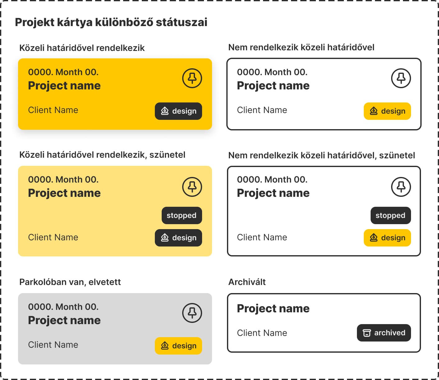 Már első ránézésre beazonosítható legyen, hogy egy-egy projekt milyen munka folyamatnál tart. Például a design fázisban lévő projektek sárgák,